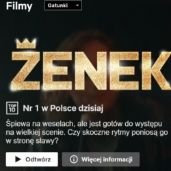 Film pt. „Zenek”, zajął pierwsze miejsce pod względem popularności i oglądalności. Wynik należy mocno docenić, tym bardziej, że mija już piąty miesiąc od premiery, a ekranowa twórczość opowiadająca o karierze wielkiego przedstawiciela muzyki tanecznej, dalej umiejscawia się na szczycie. Nie powinno nas to jednak dziwić...Zenon Martyniuk przyzwyczaił wszystkich do tego, że potrafi być na samej górze przez kolejne dekady. >>>więcej